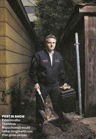 Mazuchowski, an exterminator for the past 29 years, and the seven other employees of Nevernest Extermination (3644 W. Diversey Ave, 773-772-9172) have gotten up close and personal with rats on the Blue Line, cockroaches in drug houses and mosquito infestations in housing projects - and they keep coming back for more.