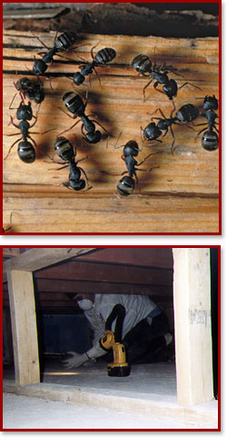 Carpenter Ants = establish nests in a number of different locations within any structure. They can produce 2,000 to 3,000 in a colony within a 6 year span. Carpenter ants are known to feed on kitchen foods, and there nesting activities can weaken building structures. They can be found in homes, grocery stores, hotels, restaurants, hospitals, and nursing homes. They have one queen, and hibernate in winter.